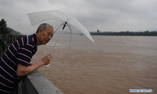 A citizen checks the flood condition on the bank of the Xiangjiang River in Changsha, central China's Hunan Province on July 9, 2019. Hunan hydrology and water resources investigation bureau issued a red alert for flood on Tuesday. As of 3 p.m. Tuesday, the water level of Xiangjiang River in Changsha has exceeded the alert level. The Juzizhou Islet scenic spot, located in Xiangjiang River, has closed for safety. (Photo: Xinhua)