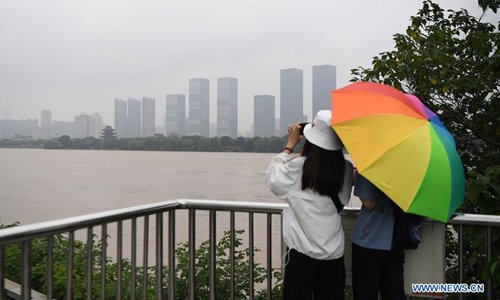 Two citizens are seen on the bank of Xiangjiang River in Changsha, central China's Hunan Province on July 9, 2019. Hunan hydrology and water resources investigation bureau issued a red alert for flood on Tuesday. As of 3 p.m. Tuesday, the water level of Xiangjiang River in Changsha has exceeded the alert level. The Juzizhou Islet scenic spot, located in Xiangjiang River, has closed for safety. (Photo: Xinhua)