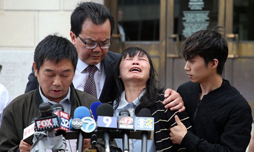 Zhang Yingying's family stand outside a US court on June 24, 2019 after Brendt Christensen was found guilty of kidnapping and murdering Zhang Yingying, a visiting Chinese scholar. Photo: VCG