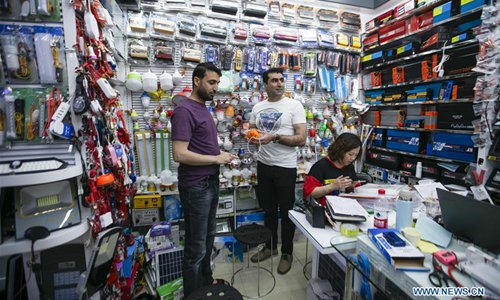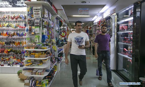 Aziz (L) looks for small ware he needs at Yiwu International Trade Mart in Yiwu City, east China's Zhejiang Province, July 9, 2019. Aziz Ullah, 41, came to Yiwu City in east China's Zhejiang Province in 2003 with his partners after his graduation from university in his home country Afghanistan. It was his first time to come to Yiwu to shop for small wares. In 2005, Aziz started his own company after being an agent for about 2 years. In recent years, the Belt and Road Initiative has brought tremendous opportunities for Aziz's company. He bought more than 200 containers of articles a year and exports them to Afghanistan, Britain, the Netherlands, Ukraine and other countries. At the same time, with the help of the China Railway Express, He imported Afghanistan's handmade carpets, dried fruits, saffron and other specialty products to China. Aziz, who has lived in Yiwu City for almost 17 years, is also a mediator of a mediation committee, which aims to help solve disputes involving foreigners. "Yiwu is my second hometown. I feel comfortable doing business and living here." Aziz said. (Photo: Xinhua)