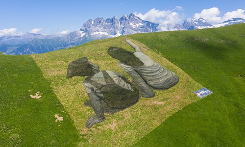 A biodegradable, ephemeral land art “fresco” created by French artist Saype shows a boy and a girl pointing to the Dents du Midi summits at Les Crosets in Les Crosets, Switzerland, on July 10, 2019. Photo: VCG