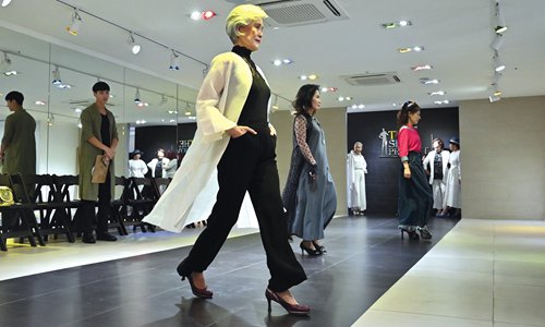 Model Choi Soon-hwa (center) practices with her colleagues at a modelling class in Seoul on June 11. Photo: AFP