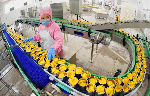 A worker is busy at the production line for canned peaches to be exported to Japan on Thursday in East China's Jiangsu Province. Photo: IC