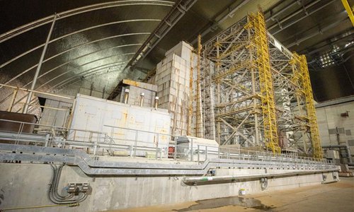 Photo taken on July 10, 2019 shows the New Safe Confinement of the Chernobyl Nuclear Power Plant in Kiev, Ukraine. Ukrainian President Volodymyr Zelensky visited Chernobyl Nuclear Power Plant (ChNPP) as the New Safe Confinement (NSC) over the fourth reactor of the power plant was put into operation Wednesday. The NSC is meant to prevent radioactive materials escaping from the fourth reactor site where a nuclear accident on April 26, 1986 took lives of at least 31 people while thousands more have died since from radiation exposure and cancer. (Ukrainian President Office/Handout via Xinhua)