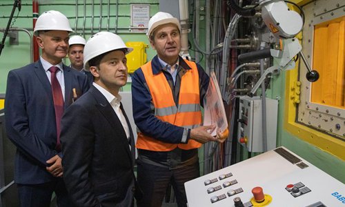 Ukrainian President Volodymyr Zelensky (C) inspects the New Safe Confinement of the Chernobyl Nuclear Power Plant in Kiev, Ukraine, July 10, 2019. Ukrainian President Volodymyr Zelensky visited Chernobyl Nuclear Power Plant (ChNPP) as the New Safe Confinement (NSC) over the fourth reactor of the power plant was put into operation Wednesday. The NSC is meant to prevent radioactive materials escaping from the fourth reactor site where a nuclear accident on April 26, 1986 took lives of at least 31 people while thousands more have died since from radiation exposure and cancer. (Ukrainian President Office/Handout via Xinhua