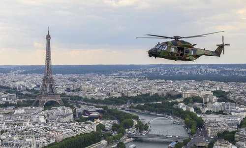 A photo taken on Thursday over Paris shows an NH90 transport helicopter with the Eiffel Tower in the background during a rehearsal ahead of the Bastille Day military air parade on Sunday. Photo: VCG