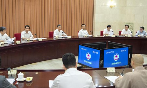 Wang Yang, a member of the Standing Committee of the Political Bureau of the Communist Party of China (CPC) Central Committee and chairman of the National Committee of the Chinese People's Political Consultative Conference (CPPCC), presides over a biweekly consultation session in Beijing, capital of China, July 12, 2019. (Xinhua/Li Tao)