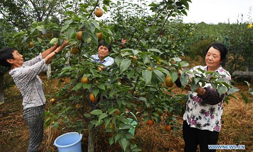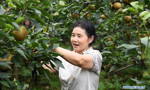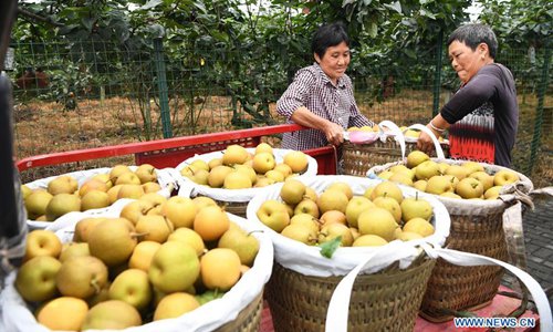 Villagers pick pears in Jiti Village of Ersheng Town, southwest China's Chongqing, July 11, 2019. The locals are busy harvesting as over 6,000 mu (about 400 hectares) of pears orchard in the village is in harvest season. The pears brought extra income for the villagers in recent years as both commodity and tourism resources. Photo:Xinhua