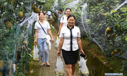 Tourists leave after they buy the pears they picked themselves in Jiti Village, Ersheng Town, southwest China's Chongqing, July 11, 2019. The locals are busy harvesting as over 6,000 mu (about 400 hectares) of pears orchard in the village is in harvest season. The pears brought extra income for the villagers in recent years as both commodity and tourism resources. Photo:Xinhua