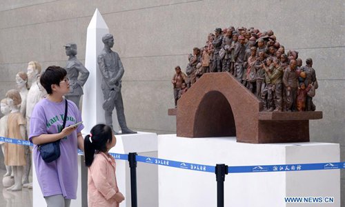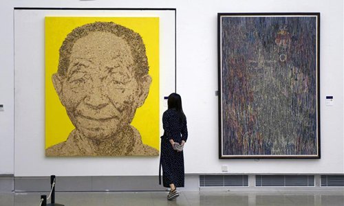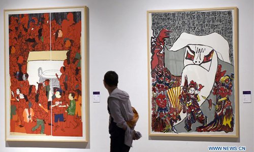 A visitor views art works displayed during the 14th Art Exhibition of Zhejiang Province held at Zhejiang Art Museum in Hangzhou, capital of east China's Zhejiang Province, July 12, 2019. More than 600 art works were on display during the 17-day exhibition. Photo:Xinhua