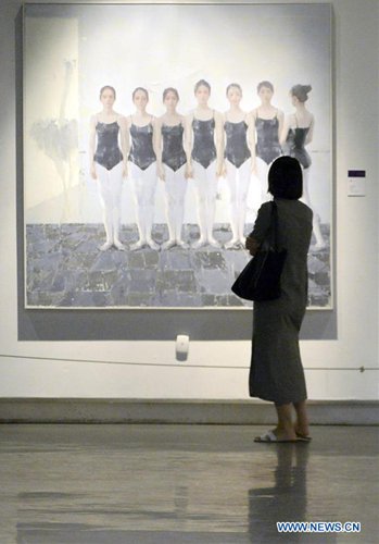 A visitor views an oil painting work displayed during the 14th Art Exhibition of Zhejiang Province held at Zhejiang Art Museum in Hangzhou, capital of east China's Zhejiang Province, July 12, 2019. More than 600 art works were on display during the 17-day exhibition.Photo:Xinhua