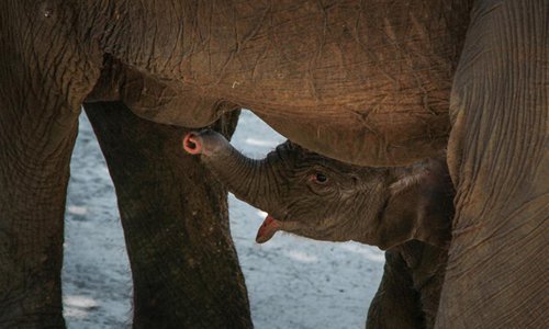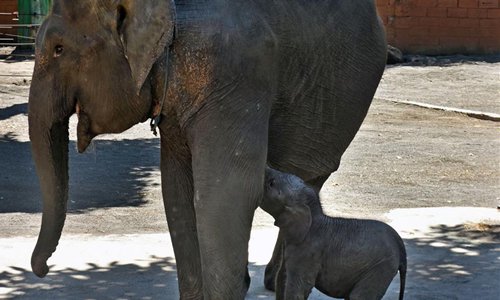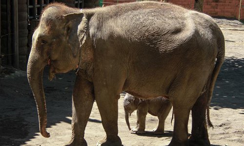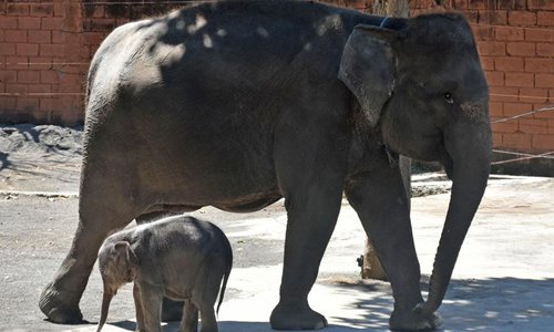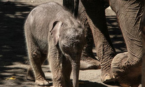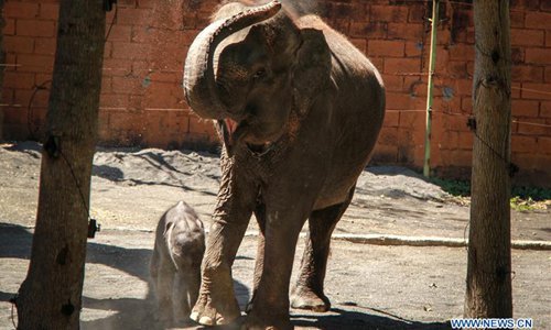 A nine-day baby Sumatran elephant stays with its mother at a zoo in Batu in Malang, Indonesia, July 13, 2019. Photo:Xinhua