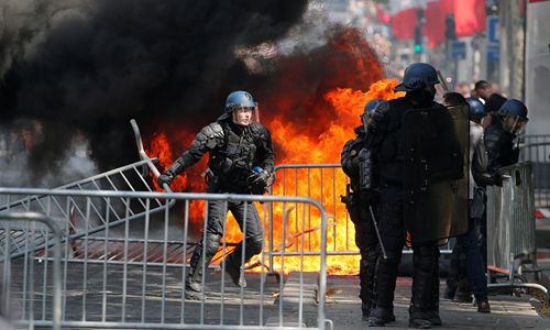 French Gendarmes remove barricades next to a burning portable toilet during clashes with protesters on the Champs Elysees Avenue after the traditional Bastille Day military parade in Paris, France, July 14, 2019. Photo: Pascal Rossignol/VCG