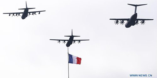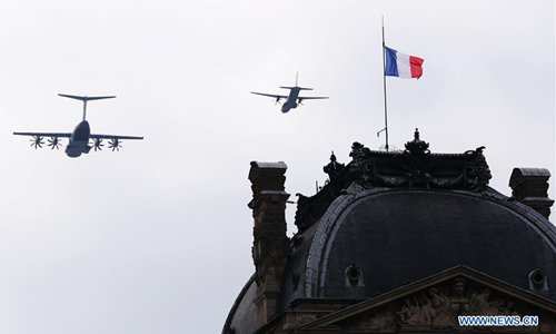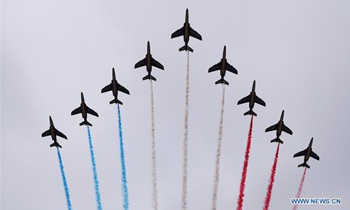 French military aircrafts fly over the Arc de Triomphe du Carrousel during the annual Bastille Day military parade in Paris, France, on July 14, 2019. (Photo: Xinhua)