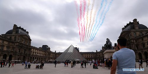 The Patrouille de France passes over the Pyramid of the Louvre Museum during the annual Bastille Day military parade in Paris, France, on July 14, 2019. (Photo: Xinhua)