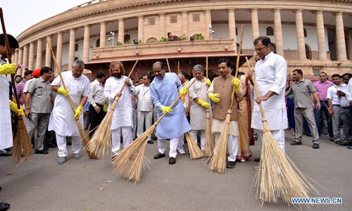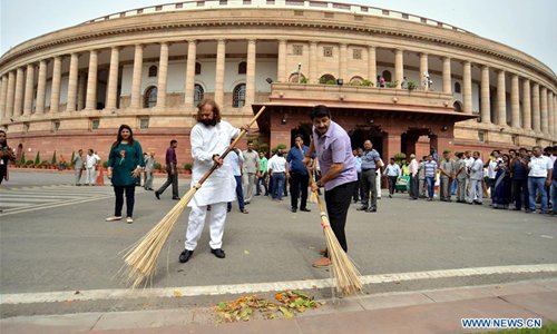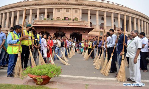 Members of Parliament and citizens stand with the brooms during a cleaning campaign at the Indian Parliament in New Delhi, India, July 14, 2019. (Photo: Xinhua)