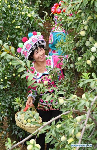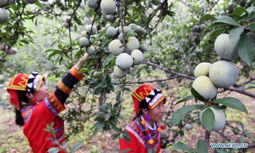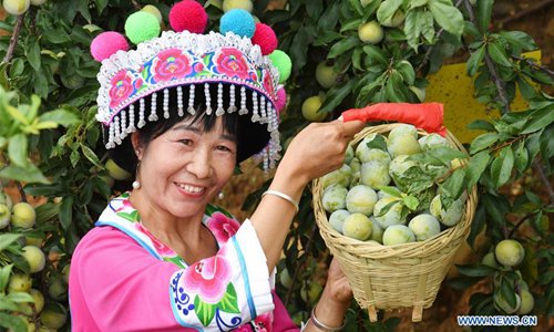 Women of the Yi ethnic group pick fruits in Xinping Village of Xinhua Township in Yuanmou County, southwest China's Yunnan Province, July 13, 2019. (Photo: Xinhua)