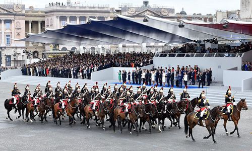 World leaders applaud as Republican Guards ride during the annual Bastille Day military parade in Paris, France on July 14, 2019. Photo: Mustafa Yalcin/Anadolu Agency/Getty Images/VCG