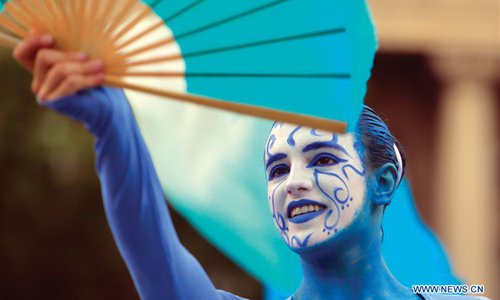 An artist performs during the 11th "B-Fit in the street" international street theater festival in Bucharest, capital of Romania, July 13, 2019. (Photo: Xinhua)