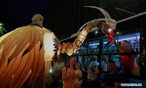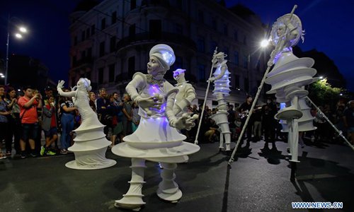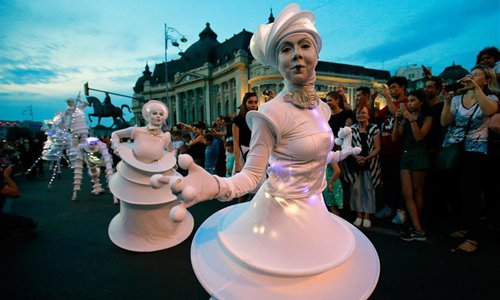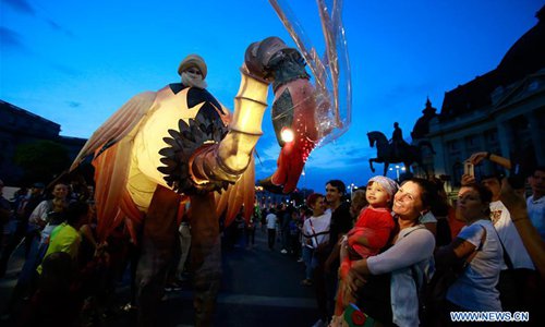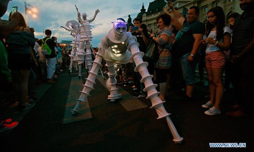 Artists perform the show "Moonlight Invasions" during the 11th "B-Fit in the street" international street theater festival in Bucharest, capital of Romania, July 13, 2019. (Photo: Xinhua)