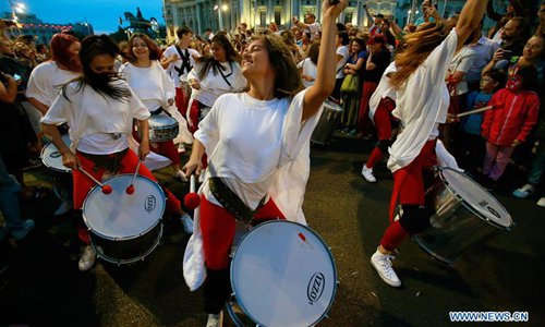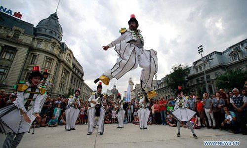 Artists perform during the 11th "B-Fit in the street" international street theater festival in Bucharest, capital of Romania, July 13, 2019. (Photo: Xinhua)
