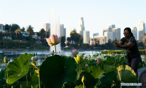 A woman takes photos of lotus flowers during the 2019 Lotus Festival in Los Angeles, the United States, July 13, 2019. (Photo: Xinhua)