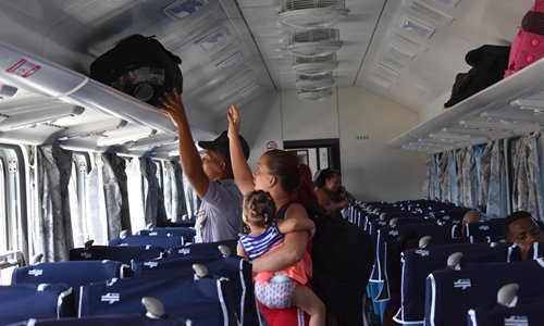 Passengers put their luggage on the luggage rack aboard a train made up entirely by Chinese wagons in Havana, capital of Cuba, July 13, 2019. The first train made up entirely by Chinese wagons began a 14-hour, 835-km journey between Havana and Santiago de Cuba, the second-largest city on the island. This convoy has 12 wagons recently arriving from China, the first of four convoys to start rolling in the coming days as part of an ambitious program to update the Cuban railway system. (Photo: Xinhua)