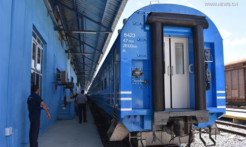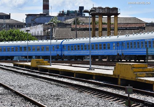 A train made up entirely by Chinese wagons stops by Havana Central Railway Station in Havana, capital of Cuba, July 13, 2019. The first train made up entirely by Chinese wagons began a 14-hour, 835-km journey between Havana and Santiago de Cuba, the second-largest city on the island. This convoy has 12 wagons recently arriving from China, the first of four convoys to start rolling in the coming days as part of an ambitious program to update the Cuban railway system. (Photo: Xinhua)