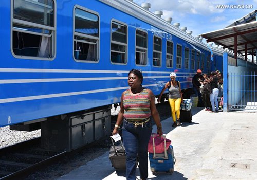 Passengers walk to board a train made up entirely by Chinese wagons in Havana, capital of Cuba, July 13, 2019. The first train made up entirely by Chinese wagons began a 14-hour, 835-km journey between Havana and Santiago de Cuba, the second-largest city on the island. This convoy has 12 wagons recently arriving from China, the first of four convoys to start rolling in the coming days as part of an ambitious program to update the Cuban railway system. (Photo: Xinhua)