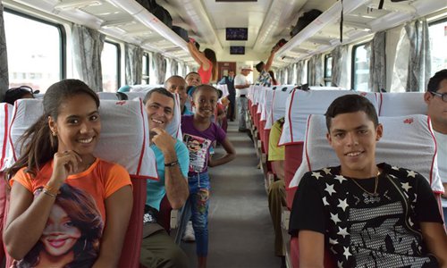 Passengers are seen aboard a train made up entirely by Chinese wagons in Havana, capital of Cuba, July 13, 2019. The first train made up entirely by Chinese wagons began a 14-hour, 835-km journey between Havana and Santiago de Cuba, the second-largest city on the island. This convoy has 12 wagons recently arriving from China, the first of four convoys to start rolling in the coming days as part of an ambitious program to update the Cuban railway system. (Photo: Xinhua)