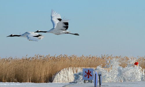 Two red-crowned cranes fly over a frozen lake in the Zhalong National Nature Reserve in Qiqihar city, Northeast China's Heilongjiang Province. Photo: VCG