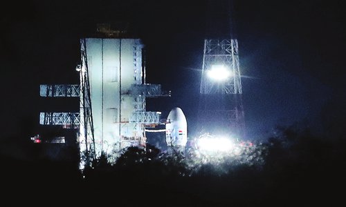 The Indian Space Research Organization's Geosynchronous Satellite Launch Vehicle (GSLV) MkIII carrying Chandrayaan-2 stands at Satish Dhawan Space Center after the mission was aborted at the last minute in Sriharikota, southern India on Monday. The mission to explore the lunar south pole was aborted less than an hour before takeoff. An Indian Space Research Organization spokesman said a "technical snag" was observed in the 640-ton launch-vehicle system. Photo: AP