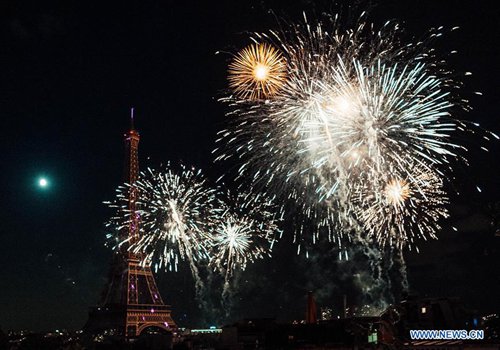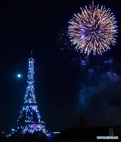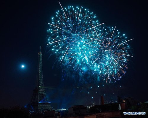 Fireworks are exploded near the Eiffel Tower in celebration of the Bastille Day in Paris, France, July 14, 2019. (Photo: Xinhua)