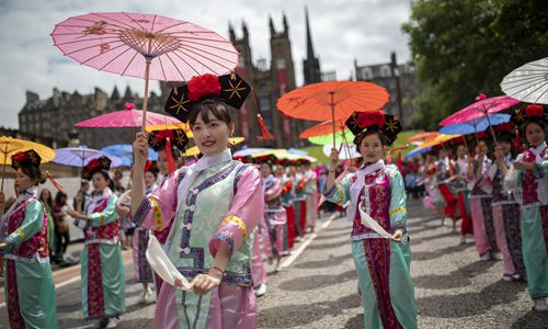 A group of performers dressed in colorful Chinese elemental costumes at the Edinburgh Festival Carnival on July 14, 2019. Photo: The Times/News Licensing/VCG