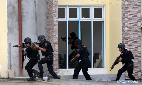 Members of the Philippine National Police (PNP) participate in a simulation exercise in Quezon City, the Philippines, July 15, 2019. The PNP showed their capabilities in responding to bombing, terrorism, and hostage-taking threats in preparation for the State of the Nation Address (SONA) of Philippine President Rodrigo Duterte. (Photo: Xinhua)