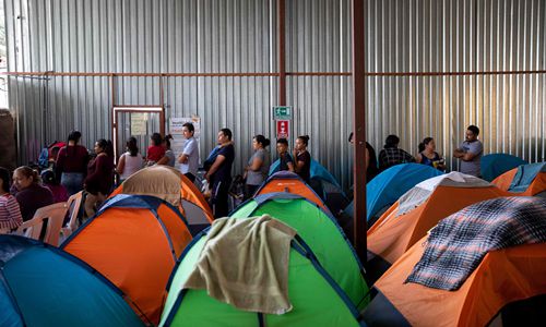 Tents are piled up in a hangar at Juventud 2000 migrant shelter in Tijuana, Baja California state, Mexico on July 13, 2019. Photo: Eduardo Jaramillo Castro/VCG