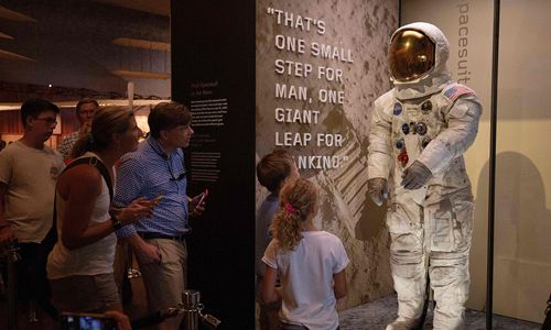 Visitors take a look at Neil Armstrong's Apollo 11 spacesuit after it was unveiled for the first time in 13 years, at the Smithsonian National Air and Space Museum in Washington, DC, on July 16, 2019. Photo: Alastair Pike/VCG