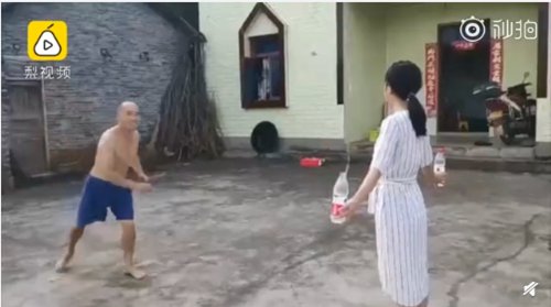 In a video on Sina Weibo, Wen stands several meters from a woman holding two bottles of water at arms length. Wen throws a chopstick at each bottle. The perfect strikes send the caps flying as water gushes from the bottle.