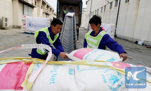 Staff load food onto a truck in Shanghai, east China, April 12, 2019. Ships carrying thousands of tonnes of rice set off from Huangpu Port in Shanghai on Friday for Somalia, the Democratic Republic of Congo (DRC) and South Sudan to help these countries cope with their food security crisis. The United Nations World Food Programme (WFP) China Office held a departure ceremony to mark China's food assistance to the African countries. (Photo: Xinhua)