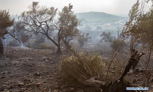 The photo taken on July 17, 2019 shows a burnt area following a wildfire in the Arab town of Arara in northern Israel. Wildfires broke out at several locations across Israel on Wednesday as an unexpected extreme heatwave hit the country. (Photo: Xinhua)