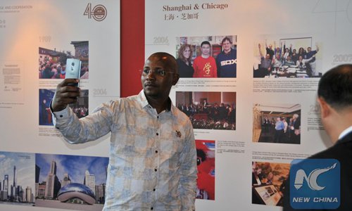 Visitors view photos during a photo exhibition with the theme of "Trans-Pacific Exchange and Cooperation -- Shanghai Commemorates the 40th Anniversary of China-U.S. Diplomatic Relations" in Houston, Texas, the United States, on July 17, 2019. An exhibition of more than 300 photos featuring cultural exchanges, economic cooperation and friendship between China and the United States opened here on Wednesday. Photo: Xinhua