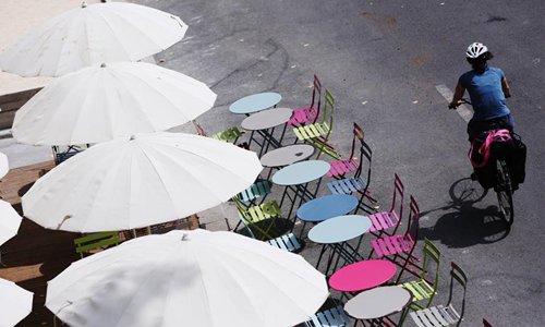 A cyclist passes a beverage shop during the Paris Plage at the banks of River Seine, in Paris, France, July 17, 2019. The annual Paris Plage (Paris beach) event is held from July 6 to Sept. 1, 2019. (Xinhua/Gao Jing)