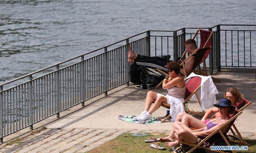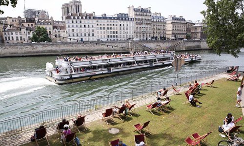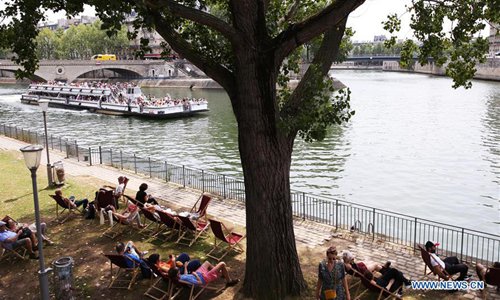 People rest during the Paris Plage at the banks of River Seine, in Paris, France, July 17, 2019. The annual Paris Plage (Paris beach) event is held from July 6 to Sept. 1, 2019. (Xinhua/Gao Jing)