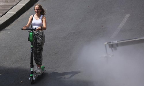 A woman passes an atomizer on the banks of River Seine in Paris, France, July 17, 2019. The temperature in France is set to rise once again from next week, with predictions that the mercury will hit 40 degrees Celsius in certain parts of the country. (Xinhua/Gao Jing)