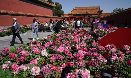 Photo taken on April 30, 2019 shows peony flowers in the Palace Museum in Beijing, capital of China. (Photo: Xinhua)