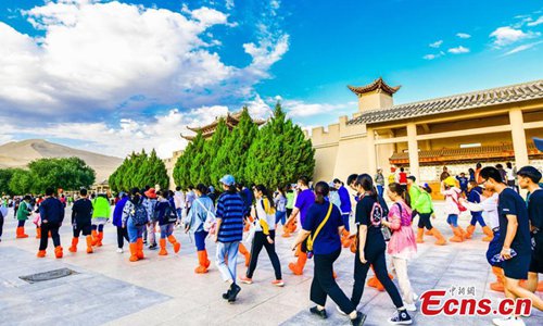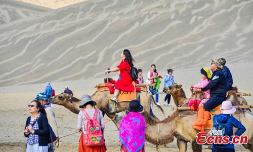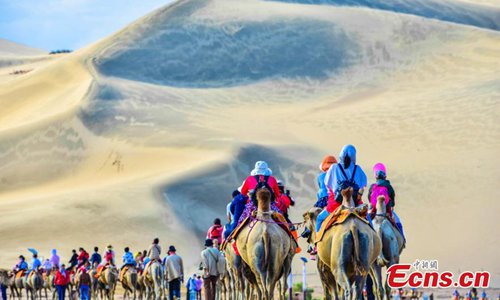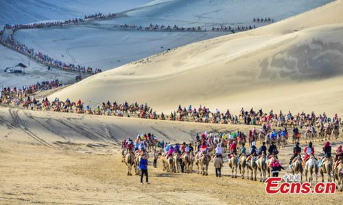 Large numbers of tourists are visiting Crescent Spring and Mingsha Mountain scenic spot in the Gobi desert in Dunhuang City, Northwest China's Gansu Province in July, the start of the peak travel season, even riding camels that can form a queue 2 kilometers long. With of a vast expanse of sand dunes, Mingsha Mountain, or "Singing Sand," is famous for its desert scenery and the mysterious sound made by wind blowing over its surface. The area’s blue sky, white clouds and rolling sands are particularly appealing to visitors. Photo:China News Service