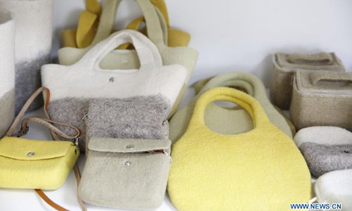Photo taken on July 17, 2019 shows felt bags at a studio in Tilekmat Village in Issyk-Kulskaya, Kyrgyzstan. Kyrgyzstan is famous for producing natural felt. With the traditional felt handicrafts getting more and more popular, many private entrepreneurs have been involved in this industry recently. Photo:Xinhua