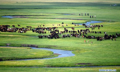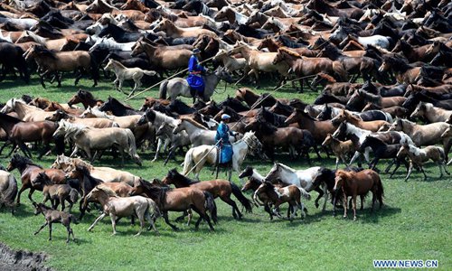 Herdsmen drive horses during an equine culture event in East Ujimqin Banner of Xilingol League, north China's Inner Mongolia Autonomous Region, July 20, 2019. (Xinhua/Ren Junchuan)