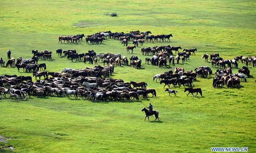 A herdsman drives horses during an equine culture event in East Ujimqin Banner of Xilingol League, north China's Inner Mongolia Autonomous Region, July 20, 2019. (Xinhua/Ren Junchuan)