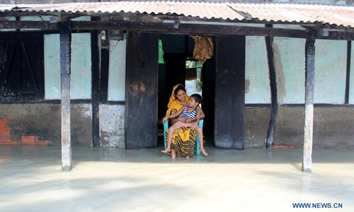 A woman sits in a waterlogged house with her child as the flood caused by incessant rain hits Hajo in India's northeastern state Assam, on July 19, 2019. The combined death toll in devastating floods in India's northeastern state of Assam and eastern state of Bihar has gone up to 119, official sources told Xinhua on Friday. (Xinhua/Stringer)